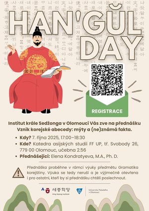 Dne 7. 10. 2025 se na Katedře asijských studií FF UP uskuteční přednáška na téma Vznik korejské abecedy: mýty a (ne)známá fakta.
