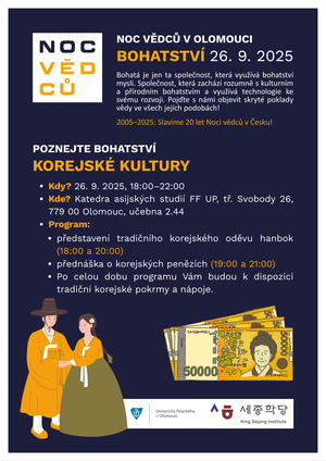 Dne 26. 9. 2025 proběhla na Katedře asijských studií FF UP Noc vědců. Akce se konala od 18:00 do 22:00 a návštěvníci si mohli užít pestrý program – přednášku o hanboku s možností si jej vyzkoušet a přednášku o korejských penězích a osobnostech či motivech s nimi spojenými. Nechyběla ani ochutnávka korejského čaje a sladkostí.