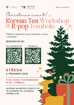 Srdečně Vás zveme na poslední dvě akce Institutu krále Sedžonga v tomto semestru. Uskuteční se 3. 12. na KAS FF UP a odstartují již v 17:00. Nejdříve proběhne workshop na výrobu tradičního korejského pečeného čaje, poté bude následovat K-tombola.