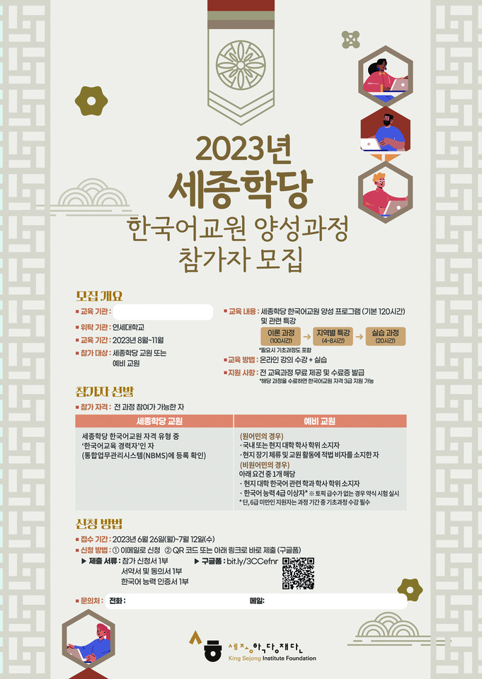 Institut krále Sedžonga v Olomouci přijímá přihlášky do kurzu pro lektory korejského jazyka organizovaného Nadací krále Sedžonga ve spolupráci s Yonsei University. Přihlásit se může každý zájemce, který získal bakalářský titul v oboru koreanistika nebo má znalosti korejského jazyka přinejmenším na úrovni 4. Přihlášku do kurzu je možné podávat do 12.7. na e-mailu michaela.lee@upol.cz nebo na Google Forms (přes QR kód na plakátu nebo link bit.ly/3CCefnr). Pro přihlášení do kurzu je nutné ve výše uvedeném termínu odevzdat přihlášku (v příloze, anglická/korejská verze), prohlášení a souhlas se zpracováním osobních údajů (v příloze, anglická/korejská verze) a certifikát TOPIK v případě, že je uchazeč jeho držitelem. S uchazeči, kteří nejsou držiteli certifikátu TOPIK, minimálně úrovně 4, bude během července uskutečněn osobní pohovor přes ZOOM v délce 15-20 minut. Termín pohovoru bude upřesněn později na e-mail uchazeče. O výsledcích výběrového řízení budou uchazeči informováni e-mailem po 19. červenci.