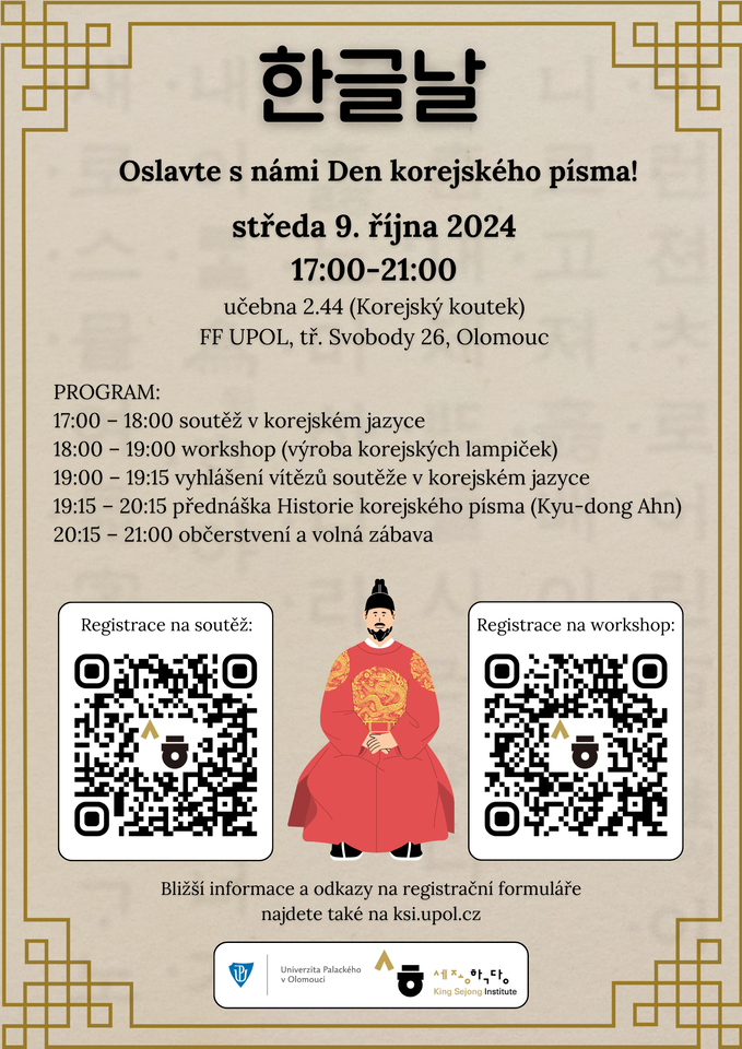 Chcete se seznámit s historií korejského písma? Nenechte si ujít přednášku ředitele KSI Kyu-dong Ahna, jenž představí vývoj korejského písma od jeho vzniku až po současnost. Přednáška proběhne v anglickém jazyce. Účastníci přednášky dostanou na památku oslavy Dne korejského písma malý dárek!
