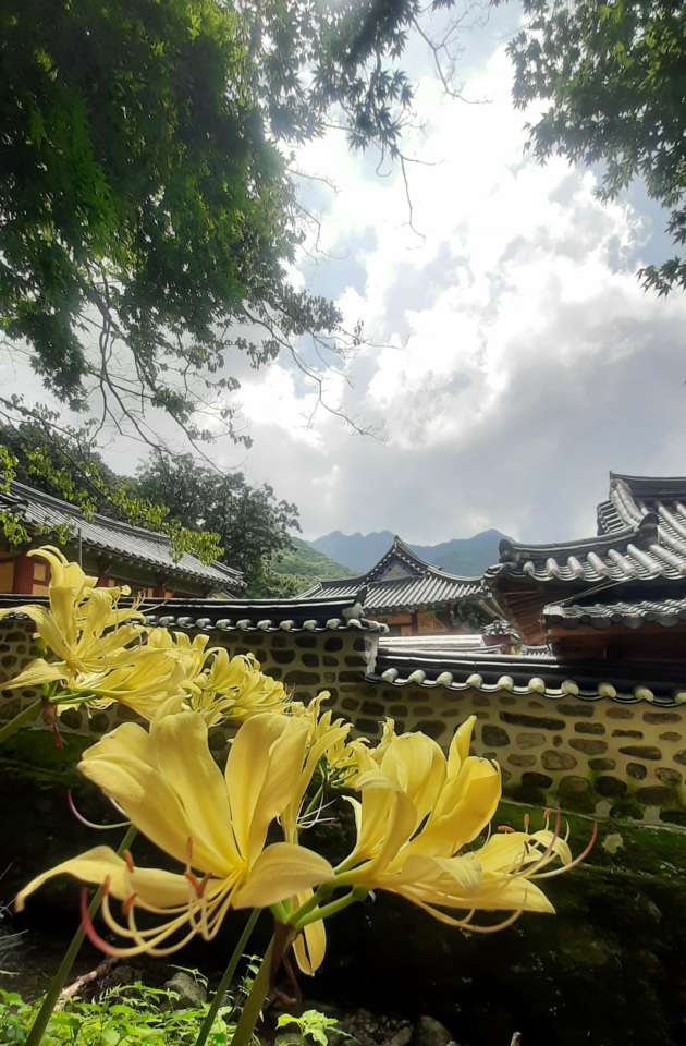 Komentář: Fotografii jsem pořídila telefonem během návštěvy kláštera Kapsa, kam jsme v srpnu loňského roku zavítali v rámci tzv. temple stay. Žluté květině na fotografii se v Koreji říká sangsahwa (상사화, 相思花), na Západě je však mimo jiné známá jako žlutá pavoučí lilie.