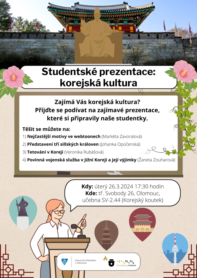 Prezentace se konají v úterý 26.3.2024 od 17:30 hodin na tř. Svobody 26, Olomouc, v učebně SV-2.44 (Korejský koutek).