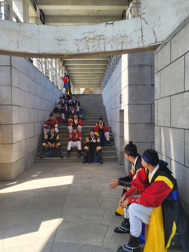Komentář: Při návštěvě válečného památníku Koreje jsme se nejdříve šli podívat na venkovní výstavu. Když jsme se následně vydali ke vchodu do budovy, narazili jsme na skupinku umělců, kteří zde zrovna čekali na svou část vystoupení ceremoniálu čestné stráže (Honor Guard Ceremony).