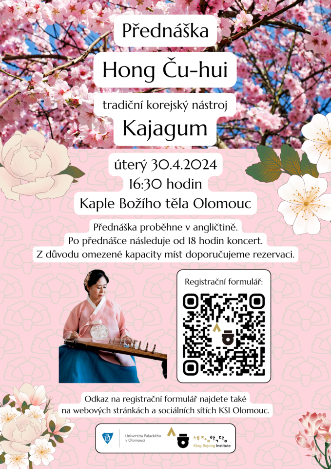 Institut krále Sedžonga v Olomouci si Vás dovoluje pozvat na sólový koncert na tradiční korejský nástroj kajagum v podání korejské hudebnice a muzikoložky Hong Ču-hui, který se koná v úterý 30.4. od 18:00 hodin v Kapli Božího Těla v Olomouci. Před začátkem koncertu proběhne na místě od 16:30 hodin přednáška v angličtině věnovaná tomuto tradičnímu korejskému nástroji. Z důvodu omezené kapacity doporučujeme zájemcům, aby si místa rezervovali předem přes QR kód na plakátě anebo na odkazu níže. Vstup na přednášku i koncert je zdarma.